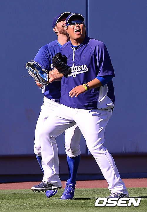 [OSEN=로스앤젤레스, 곽영래 기자] 27일(한국시간) 미국 캘리포니아주 로스앤젤레스 다저 스타디움에서 열린 2013 미국 메이저리그 LA 다저스와 샌프란시스코 자이언츠의 경기에 앞서 류현진이 카푸아노와 외야에서 타구를 잡으며 장난치고 있다.