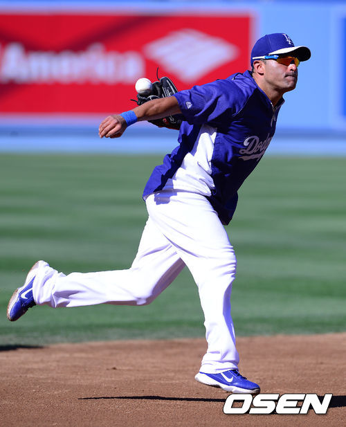 [OSEN=로스앤젤레스, 곽영래 기자] 27일(한국시간) 미국 캘리포니아주 로스앤젤레스 다저 스타디움에서 열린 2013 미국 메이저리그 LA 다저스와 샌프란시스코 자이언츠의 경기에 앞서 다저스 헤어스톤이 수비연습을 하며 재주를 부리고 있다