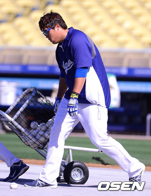 [OSEN=로스앤젤레스, 곽영래 기자] 27일(한국시간) 미국 캘리포니아주 로스앤젤레스 다저 스타디움에서 열린 2013 미국 메이저리그 LA 다저스와 샌프란시스코 자이언츠의 경기에 앞서 류현진이 공을 줍고 있다