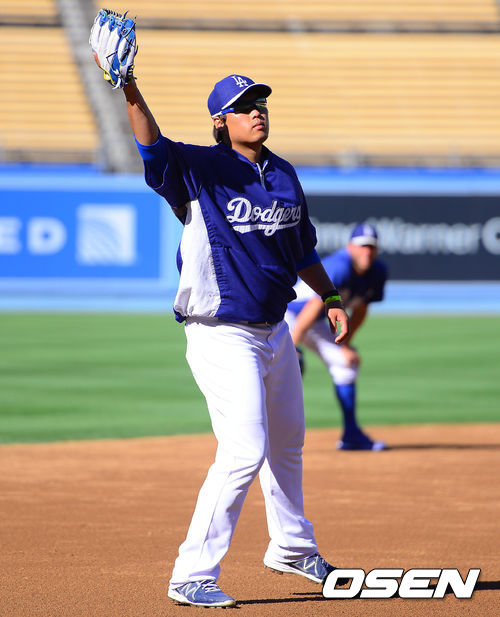 [OSEN=로스앤젤레스, 곽영래 기자] 27일(한국시간) 미국 캘리포니아주 로스앤젤레스 다저 스타디움에서 열린 2013 미국 메이저리그 LA 다저스와 샌프란시스코 자이언츠의 경기에 앞서 류현진이 내야에서 동료들의 타격훈련을 돕고 있다