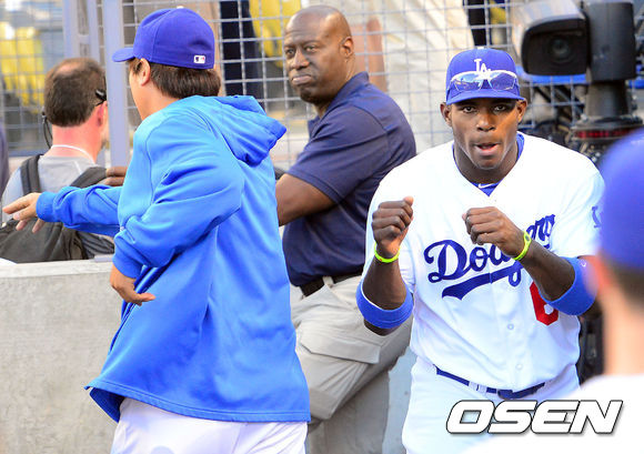 [OSEN=로스앤젤레스, 곽영래 기자] 27일(한국시간) 미국 캘리포니아주 로스앤젤레스 다저 스타디움에서 열린 2013 미국 메이저리그 LA 다저스와 샌프란시스코 자이언츠의 경기에 앞서 다저스 류현진이 푸이그와 수영 세레모니를 펼치고 있다