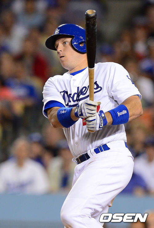 [OSEN=로스앤젤레스, 곽영래 기자] 27일(한국시간) 미국 캘리포니아주 로스앤젤레스 다저 스타디움에서 열린 2013 미국 메이저리그 LA 다저스와 샌프란시스코 자이언츠의 경기,6회말 1사 2루 다저스 A.J.엘리스가 역전 1타점 적시타를 날리고 있다