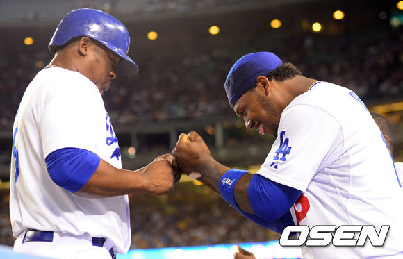 [OSEN=로스앤젤레스, 곽영래 기자] 27일(한국시간) 미국 캘리포니아주 로스앤젤레스 다저 스타디움에서 열린 2013 미국 메이저리그 LA 다저스와 샌프란시스코 자이언츠의 경기,6회말 샌프란시스코 린스컴 선발투스의 교체타임때 다저스 우리베가 라미레스와 하이파이브를 하고 있다