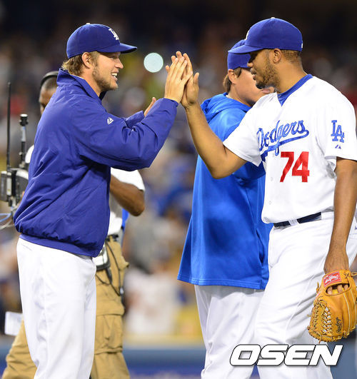 경기종료 후 6승 달성한 다저스 커쇼가 마무리 투수 잰슨과 하이파이브를 하고 있다. / soul1014@osen.co.kr
