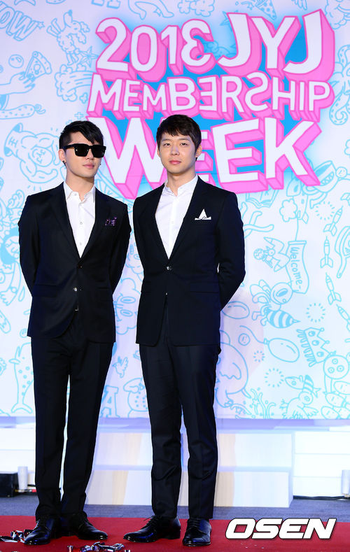 27일 오후 서울 대치동 SETEC에서 열린 'JYJ 멤버십 위크(2013 JYJ Membership Week)'에서 그룹 JYJ 준수와 유천이 기념촬영을 하고 있다.