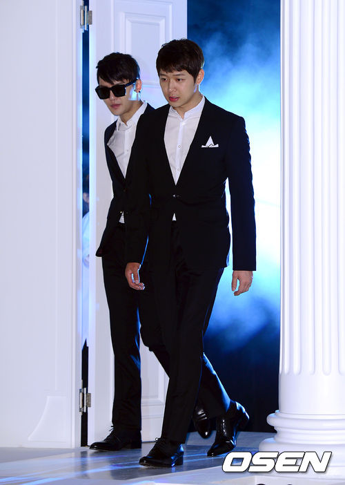 27일 오후 서울 대치동 SETEC에서 열린 'JYJ 멤버십 위크(2013 JYJ Membership Week)'에서 그룹 JYJ 준수와 유천이 개막식장으로 입장하고 있다.