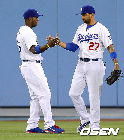 9회초 무사 1루 다저스 맷 켐프가 슈마커와 교체돼 푸이그와 하이파이브를 하고 있다./ soul1014@osen.co.kr