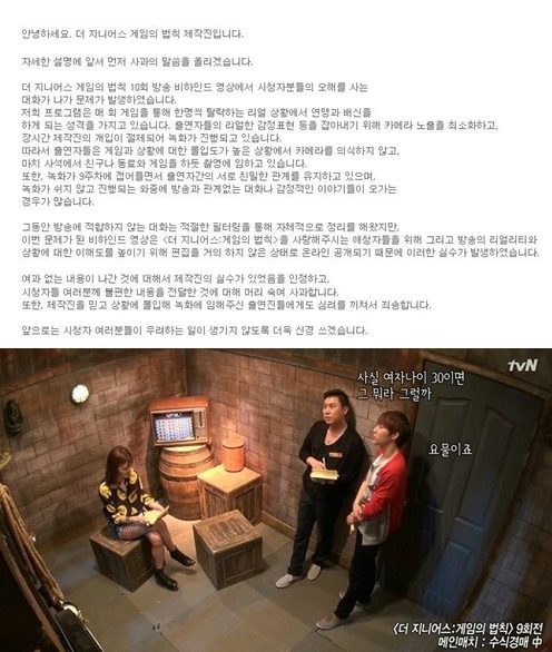 ‘요물’ 막말 논란이 거세지자 tvN 측은 ‘여과 없는 편집이 방송된 것에 제작진의 실수가 있었음을 인정하고 시청자 여러분께 불편한 내용을 전달한 것에 머리 숙여 사과드린다’면서 ‘제작진을 믿고 상황에 몰입해 녹화에 임해주신 출연진들에게도 심려를 끼쳐 죄송하다’고 공식 사과했다.