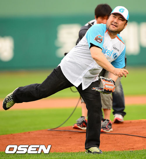 27일 오후 부산 사직구장에서 열린 2013 한국야쿠르트 세븐프로야구 롯데 자이언츠와 NC 다이노스의 경기, 영화배우 고창석이 시구를 하고 있다.