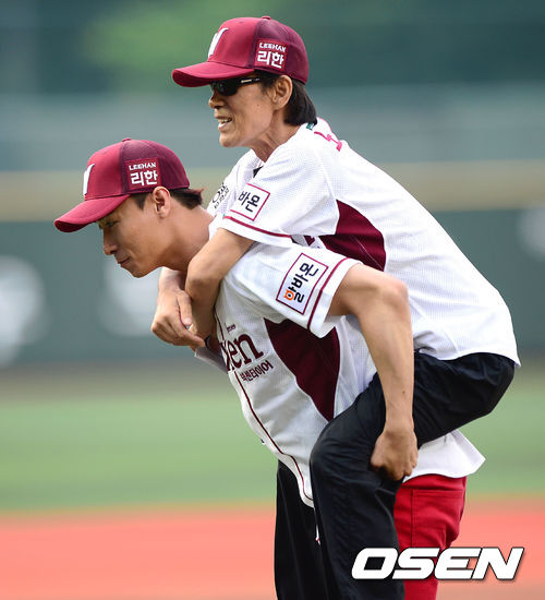 27일 오후 서울 목동야구장에서 열린 2013 한국야쿠르트 세븐프로야구 넥센 히어로즈와 SK 와이번스의 경기, 경기에 앞서 그룹 애쉬그레이 노민혁이 간암으로 투병중인 부친 노상돈씨와 시구를 마치고 경기장을 나가고 있다.