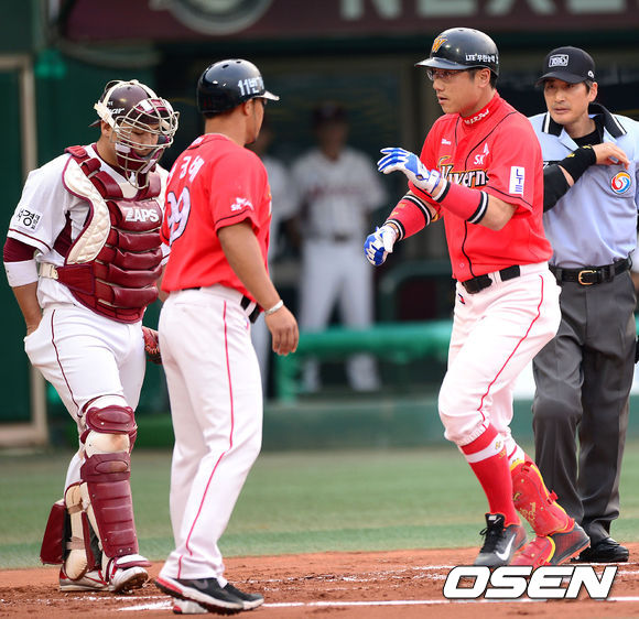 27일 오후 서울 목동야구장에서 열린 2013 한국야쿠르트 세븐프로야구 넥센 히어로즈와 SK 와이번스의 경기, 1회초 1사 1,2루에서 SK 박정권이 우월 스리런 홈런을 치고 홈에서 정경배 코치와 하이파이브를 하고 있다.