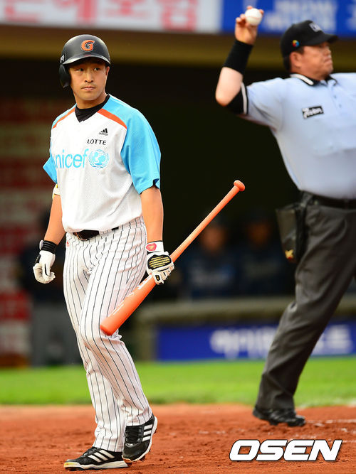 27일 오후 부산 사직구장에서 열린 2013 한국야쿠르트 세븐프로야구 롯데 자이언츠와 NC 다이노스의 경기, 1회말 1사 주자 3루 롯데 손아섭이 타석에서 포수 스트라이크 낫 아웃 후 태그를 당해 덕아웃으로 들어가고 있다.