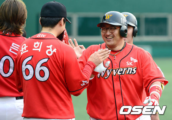 27일 오후 서울 목동야구장에서 열린 2013 한국야쿠르트 세븐프로야구 넥센 히어로즈와 SK 와이번스의 경기, 1회초 2사 1,2루에서 SK 조인성이 우월 스리런 홈런을 치고 덕아웃에서 동료들의 축하를 받고 있다.