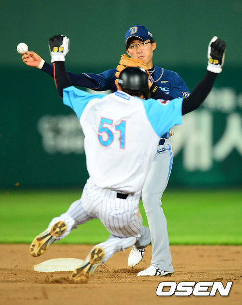 27일 오후 부산 사직구장에서 열린 2013 한국야쿠르트 세븐프로야구 롯데 자이언츠와 NC 다이노스의 경기, 6회말 무사 주자 1루 롯데 손아섭의 투수 병살타때 NC 유격수 노진혁이 2루에서 이승화를 포스아웃 시킨 후 1루로 송구하고 있다.