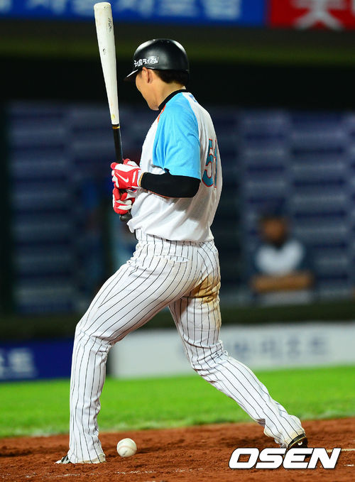 27일 오후 부산 사직구장에서 열린 2013 한국야쿠르트 세븐프로야구 롯데 자이언츠와 NC 다이노스의 경기, 7회초 2사 주자 만루 롯데 이승화가 몸에 볼을 맞고 있다.