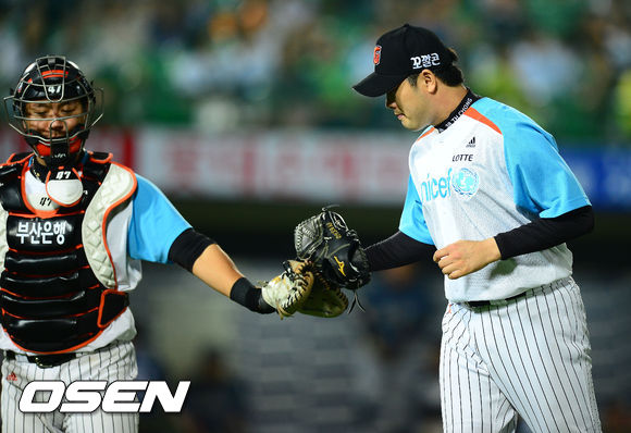 27일 오후 부산 사직구장에서 열린 2013 한국야쿠르트 세븐프로야구 롯데 자이언츠와 NC 다이노스의 경기, 8회를 마치고 롯데 정대현이 강민호와 하이파이브를 하고 있다.