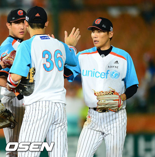 경기를 마치고 롯데 이승화가 동료들과 하이파이브를 하고 있다. / rumi@osen.co.kr