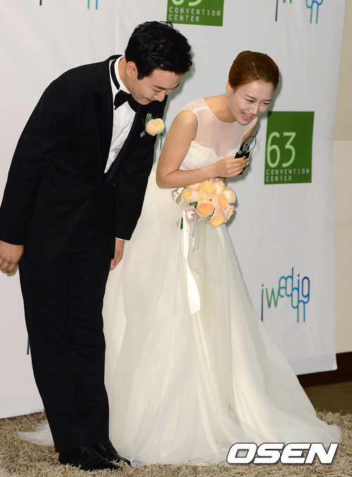 아나운서 도경완과 가수 장윤정이 취재진을 향해 인사를 하고 있다.