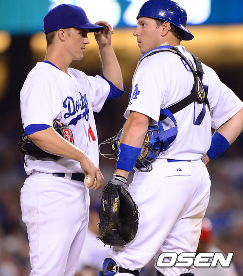 [OSEN=로스앤젤레스, 곽영래 기자] 28일(한국시간) 미국 캘리포니아주 로스앤젤레스 다저 스타디움에서 열린 2013 미국 메이저리그 LA 다저스와 필라델피아 필리스의 경기, 5회초 동점 허용한 다저스 선발투수 그레인키가 A.J.엘리스와 마운드에서 이야기를 나누고 있다