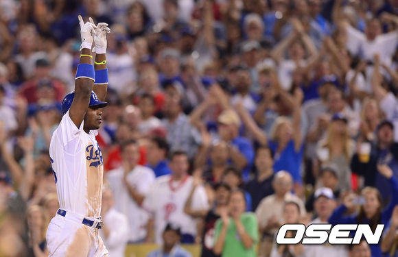 [OSEN=로스앤젤레스, 곽영래 기자] 28일(한국시간) 미국 캘리포니아주 로스앤젤레스 다저 스타디움에서 열린 2013 미국 메이저리그 LA 다저스와 필라델피아 필리스의 경기, 7회말 2사 만루 다저스 푸이그가 역전 2타점 적시타를 날리고 환호하고 있다