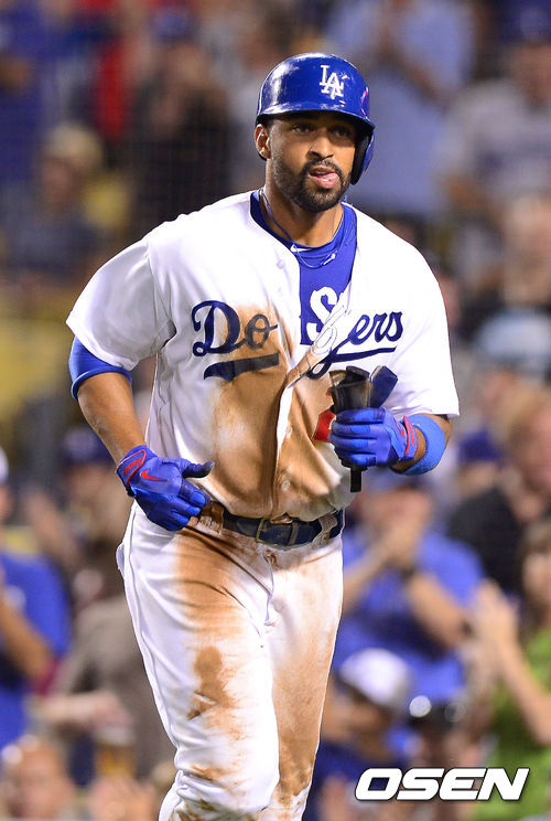 8회말 1사 3루 A.J.엘리스의 희생플라이때 3루 주자 맷 켐프가 홈을 밟은 뒤 더그아웃으로 들어가고 있다. / soul1014@osen.co.kr