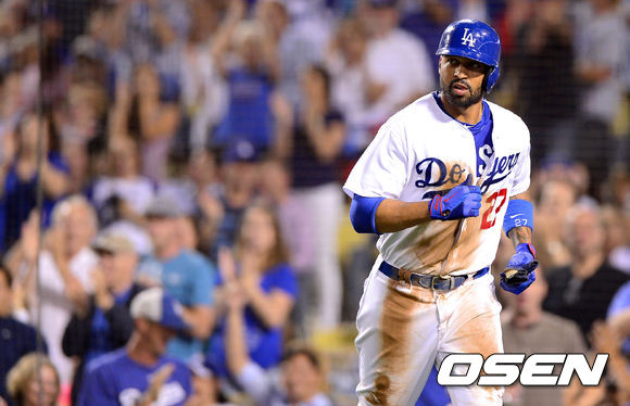 8회말 1사 3루 A.J.엘리스의 희생플라이때 3루 주자 맷 켐프가 홈을 밟은 뒤 더그아웃으로 들어가고 있다. / soul1014@osen.co.kr