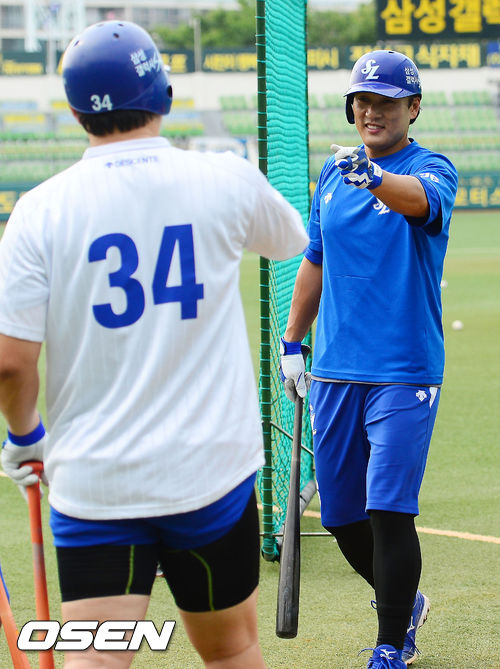 28일 오후 대구 시민운동장에서 2013 한국야쿠르트 세븐프로야구 삼성 라이온즈와 KIA 타이거즈의 경기가 열릴 예정인 가운데 삼성 이승엽이 타격연습을 마친 후 최형우와 하이파이브를 하고 있다.