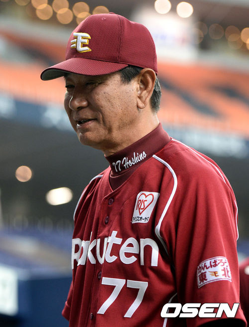 경기전 라쿠텐 호시노 감독이 취재진과 이야기를 나누고 있다.