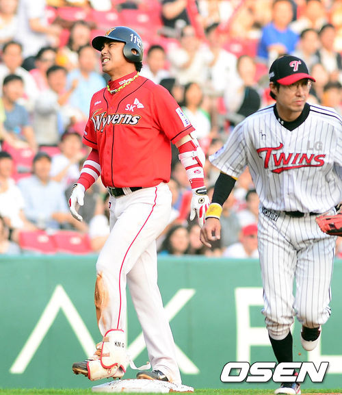28일 오후 서울 잠실구장에서 열린 '2013 한국야쿠르트 세븐 프로야구' LG 트윈스와 SK 와이번스의 경기 2회초 2사 1루 김강민이 1타점 2루타를 친 후 3루까지 달리다 태그아웃 당한 후 아쉬워하고 있다.