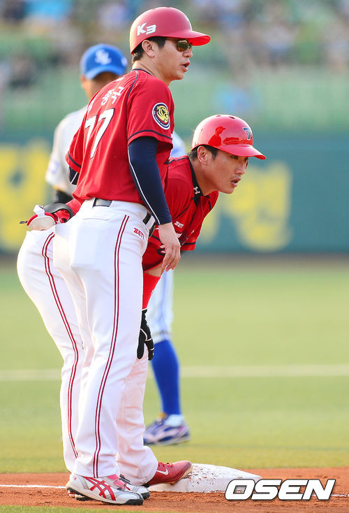 28일 오후 대구 시민운동장에서 열린 2013 한국야쿠르트 세븐프로야구 삼성 라이온즈와 KIA 타이거즈의 경기, 1회초 1사 1루 KIA 김주찬이 1타점 2루타를 날린 후 포수 실책을 틈타 3루에 세이프, 김종국 코치와 기쁨을 나누고 있다.
