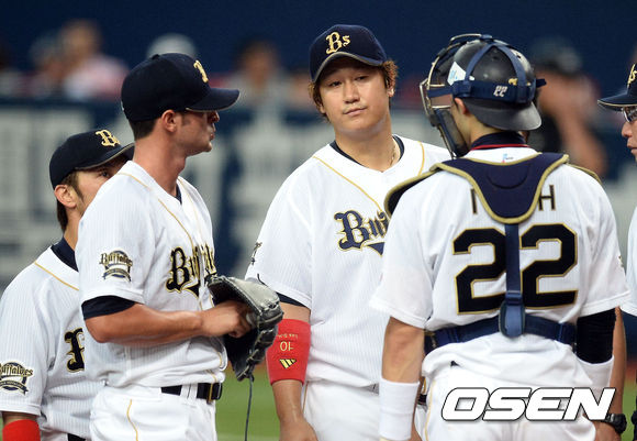 5회초 무사 오릭스 알렉산드로 마에스트리가 백투백 홈런을 허용하자 오릭스 선수들이 마운드에 오려 이야기를 나누고 있다.