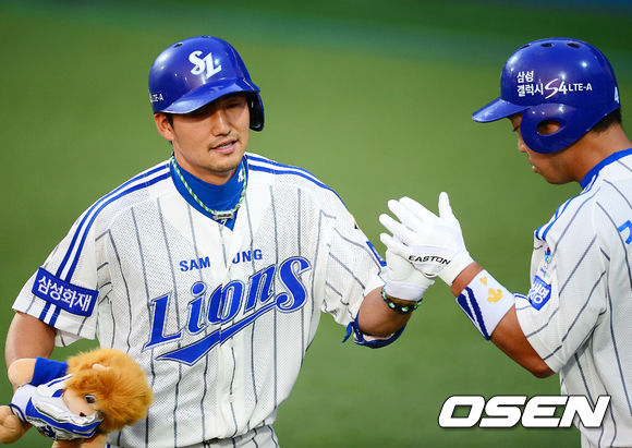 28일 오후 대구 시민운동장에서 열린 2013 한국야쿠르트 세븐프로야구 삼성 라이온즈와 KIA 타이거즈의 경기, 3회말 선두타자 삼성 김상수가 좌월 동점 솔로홈런을 날린 후 홈에서 김태완과 하이파이브를 하고 있다.