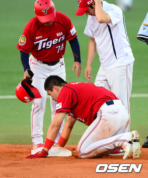 28일 오후 대구 시민운동장에서 열린 2013 한국야쿠르트 세븐프로야구 삼성 라이온즈와 KIA 타이거즈의 경기, . 3회초 1사 1루 KIA 김주찬 타석때 1루주자 신종길이 2루도루를 시도하다 삼성 2루수 김태완의 무릎에 머리를 부딪혀 고통스러워하고 있다.
