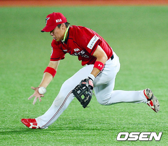 28일 오후 대구 시민운동장에서 열린 2013 한국야쿠르트 세븐프로야구 삼성 라이온즈와 KIA 타이거즈의 경기, 5회말 2사 주자 없는 상황에서 삼성 배영섭의 내야안타때 KIA 2루수 안치홍이 볼을 놓쳤다 잡고 있다.
