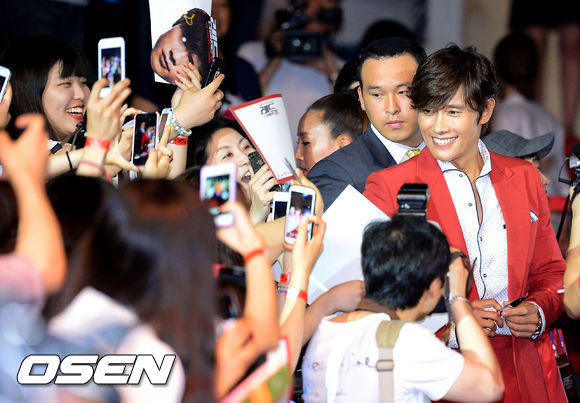 28일 오후 서울 광장동 쉐라톤 워커힐에서 진행된 영화 '레드:더 레전드' 쇼케이스에서 이병헌이 팬들을 바라보며 미소짓고 있다.
