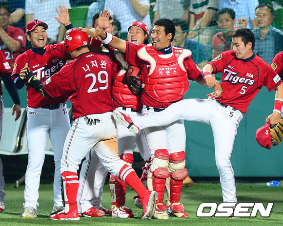 28일 오후 대구 시민운동장에서 열린 2013 한국야쿠르트 세븐프로야구 삼성 라이온즈와 KIA 타이거즈의 경기, 8회초 무사 주자 1루 KIA 나지완이 차우찬을 상대로 좌월 투런 홈런을 날린 후 덕아웃에서 동료들과 기쁨을 나누고 있다.