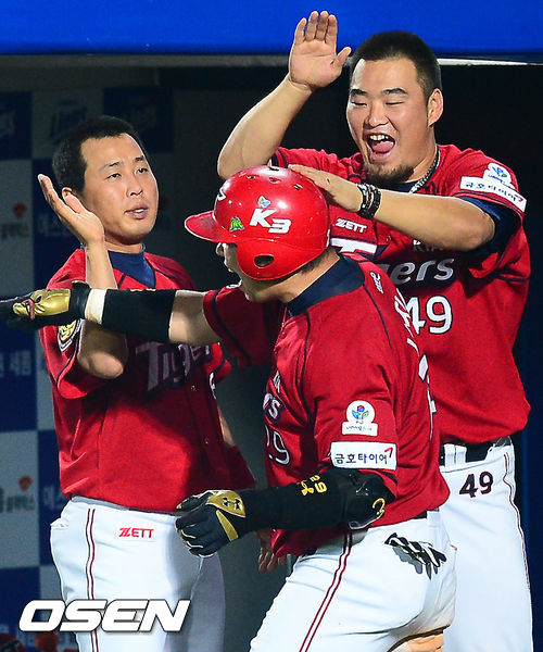 28일 오후 대구 시민운동장에서 열린 2013 한국야쿠르트 세븐프로야구 삼성 라이온즈와 KIA 타이거즈의 경기, 8회초 무사 주자 1루 KIA 나지완이 차우찬을 상대로 좌월 투런 홈런을 날린 후 덕아웃에서 동료들과 기쁨을 나누고 있다.
