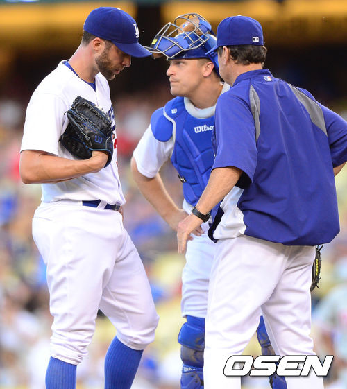 [OSEN=로스앤젤레스, 곽영래 기자] 29일(한국시간) 미국 캘리포니아주 로스앤젤레스 다저스 스타디움에서 열린 2013 미국 메이저리그 LA 다저스와 필라델피아 필리스의 경기, 1회초 3실점 허용한 다저스 선발투수 카푸아노가 허니컷 코치와 이야기를 나누고 있다
