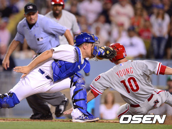 [OSEN=로스앤젤레스, 곽영래 기자] 29일(한국시간) 미국 캘리포니아주 로스앤젤레스 다저스 스타디움에서 열린 2013 미국 메이저리그 LA 다저스와 필라델피아 필리스의 경기, 6회초 1사 1,2루 필라델피아 브라운의 1타점 적시타때 2루 주자 마이클 영이 홈쇄도해 세이프 되고 있다