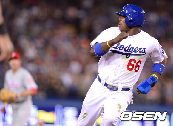 [OSEN=로스앤젤레스, 곽영래 기자] 29일(한국시간) 미국 캘리포니아주 로스앤젤레스 다저스 스타디움에서 열린 2013 미국 메이저리그 LA 다저스와 필라델피아 필리스의 경기,6회말 2사 1루 밴 슬라이크의 1타점 적시타때 1루 주자 푸이그가 홈 쇄도하고 있다