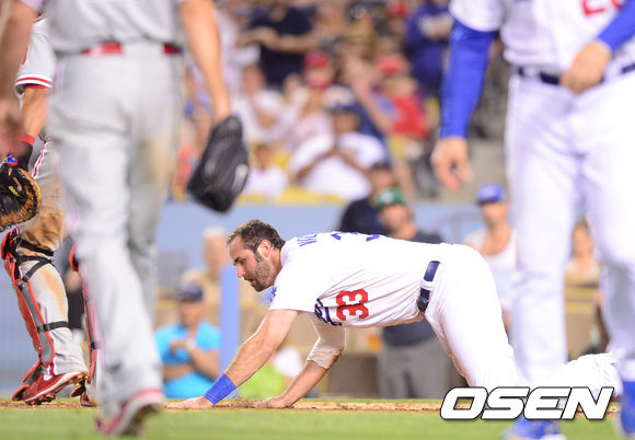 [OSEN=로스앤젤레스, 곽영래 기자] 29일(한국시간) 미국 캘리포니아주 로스앤젤레스 다저스 스타디움에서 열린 2013 미국 메이저리그 LA 다저스와 필라델피아 필리스의 경기,6회말 2사 2루 다저스 라미레스의 안타때 2루 주자 밴 슬라이크가 필라델피아 루이스 포스에게 태그아웃된 후 아쉬워하고 있다