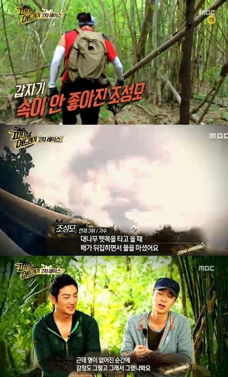 조성모는 지난 28일 방송된 MBC 예능프로그램 '파이널 어드벤처' 2차 레이스에서 대나무 뗏목을 만들어 강을 건너는 미션 수행 중 긴장감과 체력적 열세에 구토를 하고 말았다.