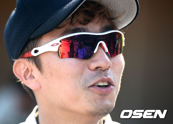 29일 오후 경기도 김포시 송일야구장에서 열린 '제4회 니베아 맨 컵 전국생활체육 야구대회' 32강 조마조마와 장작불야구단의 경기, 경기후 조마조마 성대현이 인터뷰를 하며 미소짓고 있다.