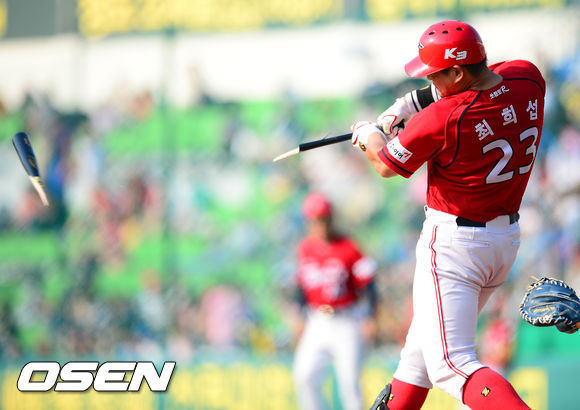 29일 오후 대구 시민운동장에서 열린 2013 한국야쿠르트 세븐프로야구 삼성 라이온즈와 KIA 타이거즈의 경기, 1회초 2사 주자 1,2루 KIA 최희섭이 유격수 플라이 타구를 날리며 배트가 부러지고 있다.