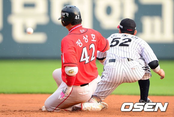 29일 오후 서울 잠실야구장에서 열린 2013 한국야쿠르트 세븐프로야구 LG 트윈스와 SK 와이번스의 경기, 4회말 2사에서 SK 정상호가 좌전 안타를 치고 2루에서 슬라이딩을 하고 있다.