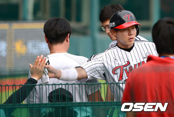 29일 오후 서울 잠실야구장에서 열린 2013 한국야쿠르트 세븐프로야구 LG 트윈스와 SK 와이번스의 경기, 5회말 2사 만루에서 SK 백인식의 폭투로 홈을 밟은 LG 3루주자 현재윤이 덕아웃에서 동료들과 하이파이브를 하고 있다.