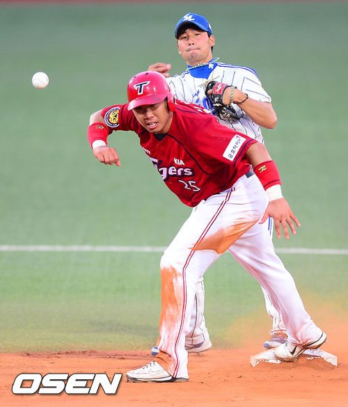 29일 오후 대구 시민운동장에서 열린 2013 한국야쿠르트 세븐프로야구 삼성 라이온즈와 KIA 타이거즈의 경기, 6회초 무사 주자 1루 KIA 안치홍의 3루수 병살타때 삼성 유격수 김상수가 2루에서 이범호를 포스아웃 시킨 후 1루로 송구하고 있다.