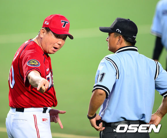 29일 오후 대구 시민운동장에서 열린 2013 한국야쿠르트 세븐프로야구 삼성 라이온즈와 KIA 타이거즈의 경기, 7회초 2사 주자 1루 KIA 김주찬 타구에 대해 안타에서 아웃으로 판정이 번복되자 KIA 선동열 감독이 강하게 항의하고 있다.