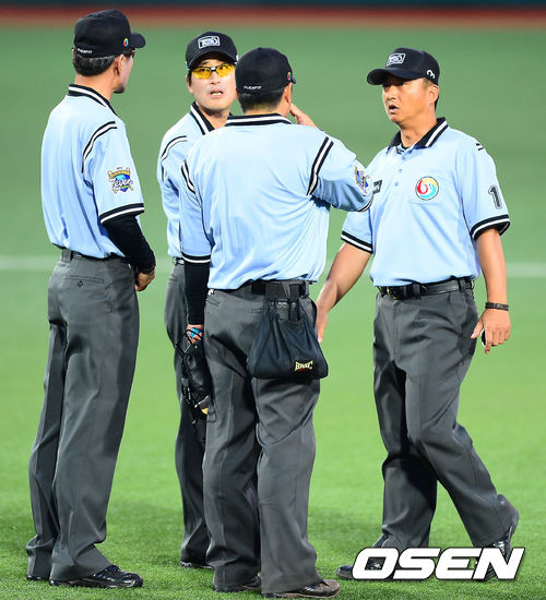 29일 오후 대구 시민운동장에서 열린 2013 한국야쿠르트 세븐프로야구 삼성 라이온즈와 KIA 타이거즈의 경기, 7회초 2사 주자 1루 KIA 김주찬 타구에 대해 심판들이 모여 협의 한 끝에 안타에서 아웃으로 판정이 번복되고 있다.