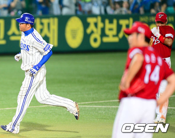 29일 오후 대구 시민운동장에서 열린 2013 한국야쿠르트 세븐프로야구 삼성 라이온즈와 KIA 타이거즈의 경기, 8회말 선두타자 삼성 채태인이 좌중월 솔로홈런을 날린 후 그라운드를 돌고 있다.